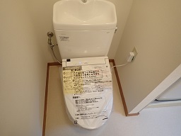 タンク式の洋式トイレです.浴室とトイレは別々に設置されています.温水便座(ウオッシュレット)です. (新品の時に撮影しましたので保護フィルムがついたままの写真です)